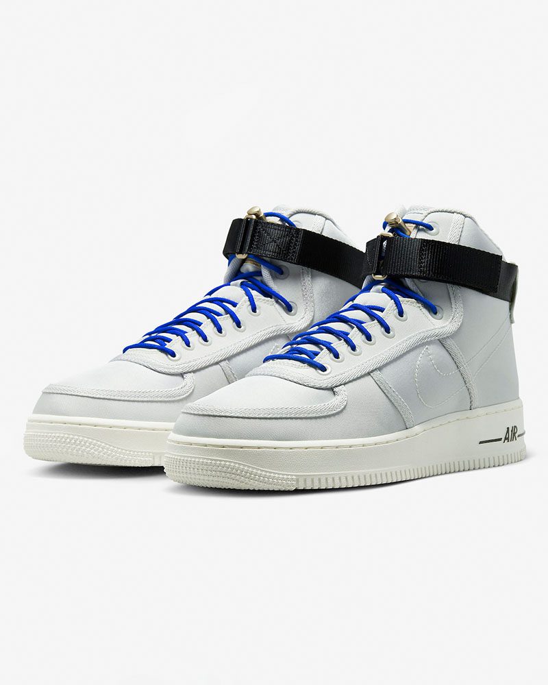 Las Nike Air Force 1 High “Moving Company” en color gris (estilo DV0790‑001) se lanzaron el 2 de febrero de 2023, como parte de la colección inspirada en empresas de mudanza. Están confeccionadas con una parte superior de lona gris claro (“Photon Dust”), adornada con costuras de Swoosh tonales bordadas, una correa al tobillo negra, cordones con sistema toggle azul real y lengüeta con etiqueta “Moving Company” evocando cajas de embalaje. La mediasuela es de tono crema “sail”, apoyada en una suela de goma blanca, mientras que los interiores también incluyen grafismos temáticos.