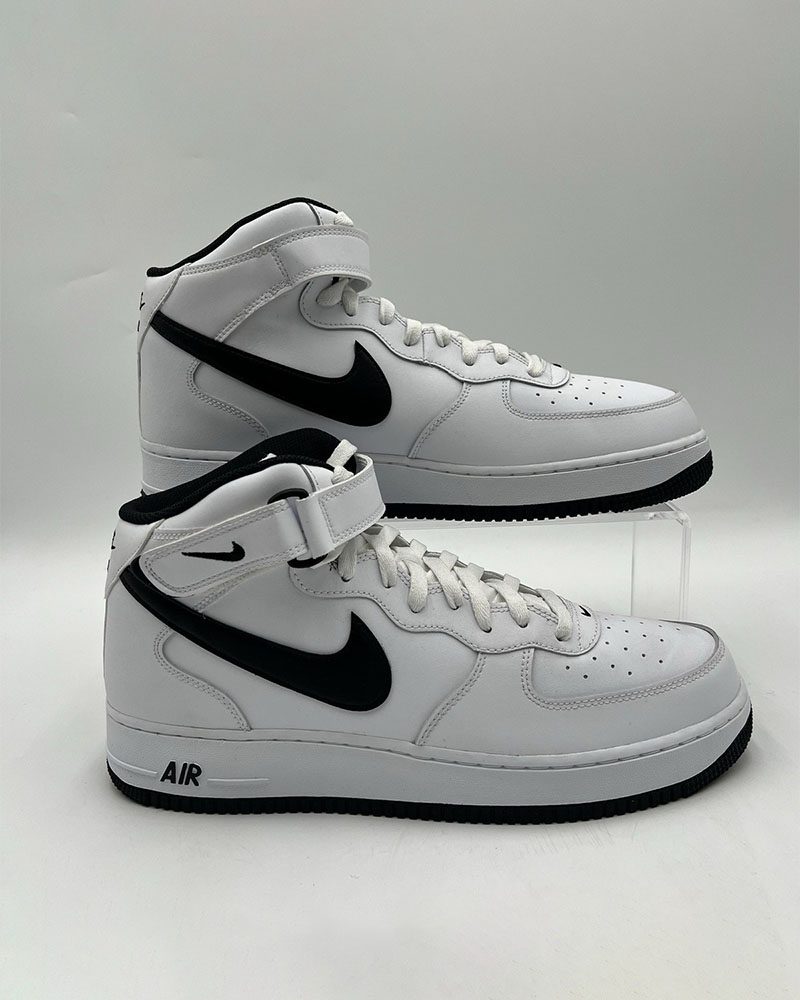 Las Nike Air Force 1 Mid “Black & White” (estilo clásico) fueron lanzadas aproximadamente en 2023, dentro de la constante renovación de colorways del modelo High/Mid, que originalmente debutó en 1982 con la emblemática tecnología Air y correa al tobillo característica. Esta variante combina una parte superior en cuero liso totalmente blanco, contrastada por un Swoosh negro en ambos lados, un talón y suela exterior negros, y una mediasuela blanca que mantiene el icónico perfil del AF1. Conserva además la ventilación perforada en la puntera, la correa al tobillo para ajuste y suela de goma con patrón circular para tracción, ofreciendo una estética atemporal en dos tonos que resalta su herencia urbana