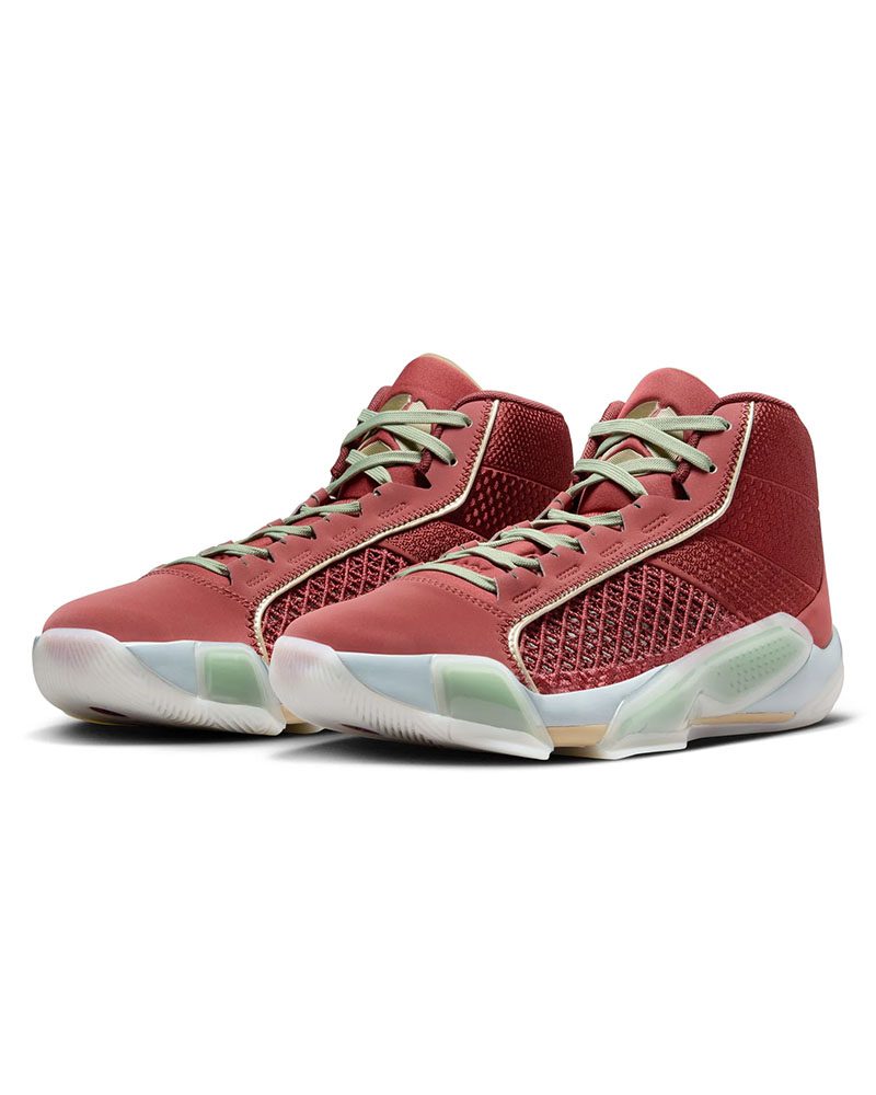 Las Air Jordan XXXVIII “Chinese New Year” (código FQ8894‑600), celebrando el Año del Dragón, se lanzaron el 24 de enero de 2024. Su parte superior combina nubuck y ante en tonos cedro rojo profundo, junto a paneles de mesh y textiles, con detalles en verde aceite (jade) como guiños a la buena fortuna, y acentos dorados metálicos en la lengüeta con logo Jumpman. La suela semitranslúcida, mediasuela con Zoom Strobel y Cushlon 3.0, más la placa estabilizadora X‑Plate, hacen de este modelo una opción de alto rendimiento en la cancha.